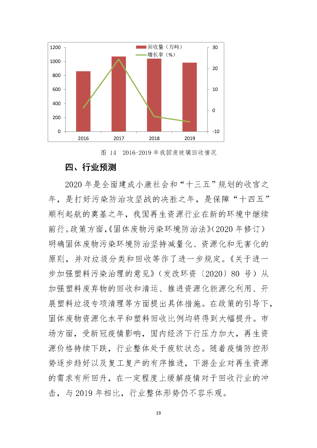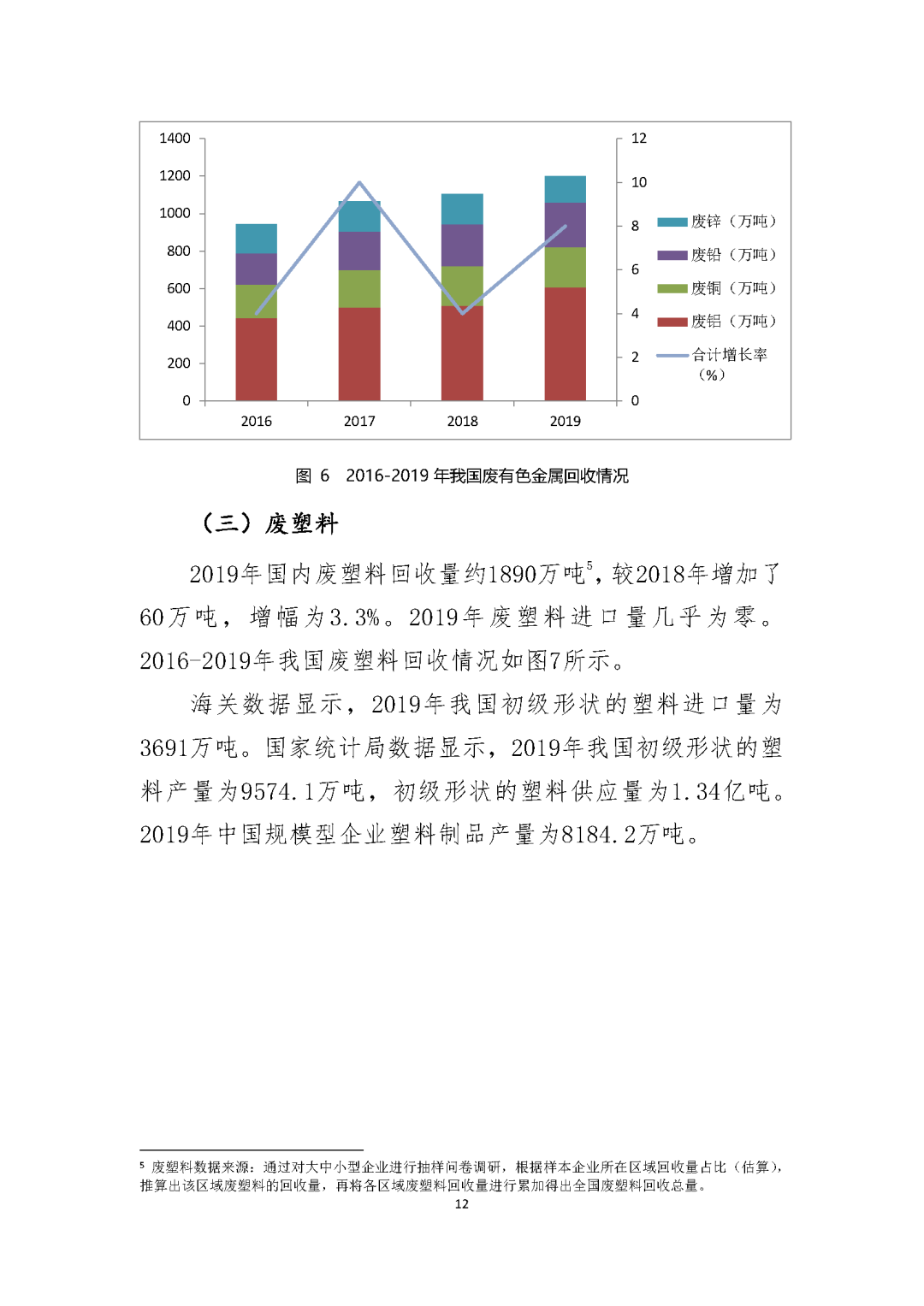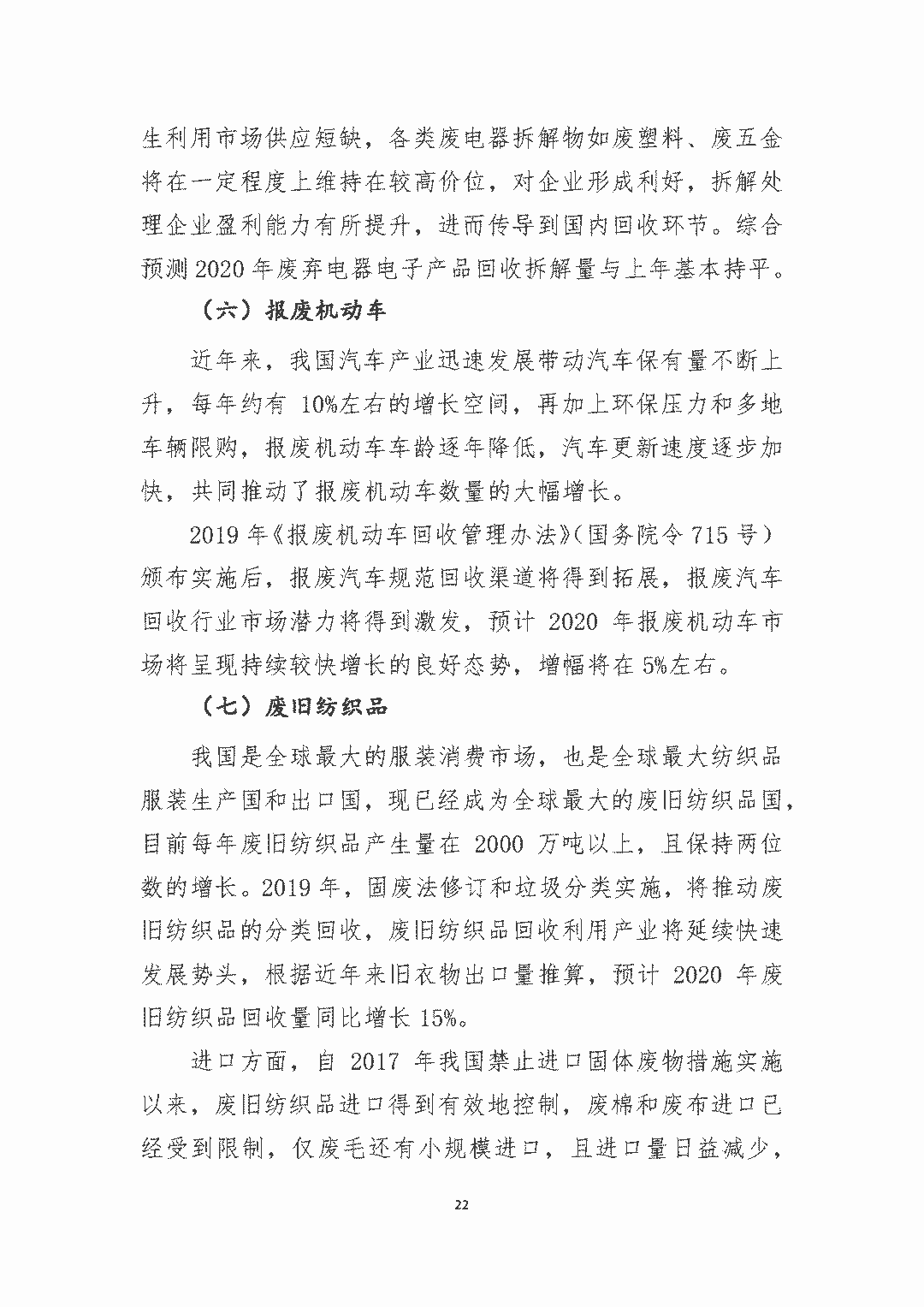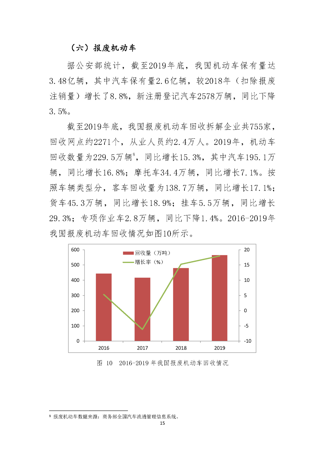 在綠色發(fā)展理念引領下,我國再生資源回收行業(yè)進一步發(fā)展壯大,再生資源回收體系不斷完善,行業(yè)創(chuàng)新升級步伐不斷加快;十大品種再生資源回收總量和回收總額取得新突破,行業(yè)規(guī)模和發(fā)展質(zhì)量進一步提升;深刻影響再生資源回收行業(yè)的多項重大利好政策相繼出臺,我國再生資源回收產(chǎn)業(yè)迎來了新的發(fā)展契機。為全面系統(tǒng)地反映2019年再生資源回收行業(yè)的基本情況,更好地服務企業(yè)和社會公眾,商務部流通業(yè)發(fā)展司整合各方資源,組織編寫發(fā)布《中國再生資源回收行業(yè)發(fā)展報告(2020)》。