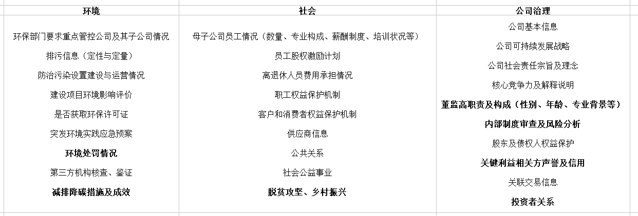 隨著可持續(xù)發(fā)展理念在國內(nèi)的逐步推進,2021年6月證監(jiān)會發(fā)布了《公開發(fā)行證券的公司信息披露內(nèi)容與格式準則第2號—年度報告的內(nèi)容與格式(2021年修訂)》(以下簡稱《年報格式準則(2021修訂)》)和《公開發(fā)行證券的公司信息披露內(nèi)容與格式準則第3號—半年度報告的內(nèi)容與格式(2021年修訂)》(以下簡稱《半年報格式準則(2021修訂)》)。相較于證監(jiān)會2017年發(fā)布的年報格式準則,《年報格式準則(2021修訂)》進一步明確了上市企業(yè)ESG信息披露標準和格式。從環(huán)境層面,《年報格式準則(2021修訂)》不僅要求企業(yè)定性、定量的對排污信息進行披露,還要求企業(yè)披露報告期內(nèi)因環(huán)境問題受到的行政處罰情況。此外,還鼓勵企業(yè)披露所采取的減少碳排放措施及減排效果,引導企業(yè)提高對環(huán)境保護及減排降碳的關(guān)注度。從社會層面,《年報格式準則(2021修訂)》綜合我國目前經(jīng)濟發(fā)展狀況,對信息披露要求進行更新,比如將原本要求披露的“履行扶貧社會責任的情況”變更為“鞏固脫貧攻堅、鄉(xiāng)村振興等工作情況”。從公司治理層面,《年報格式準則(2021修訂)》提出了公司關(guān)鍵利益相關(guān)方的信譽及信用管理,完善企業(yè)內(nèi)部多維度監(jiān)管和定期審核評估,強化了企業(yè)對投資者的管理。