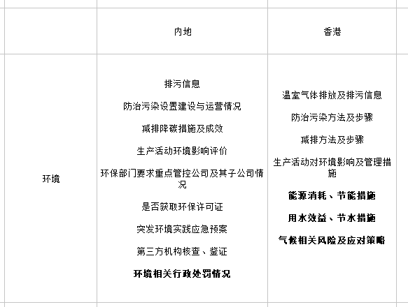 環(huán)境層面而言,內(nèi)地證監(jiān)會發(fā)布的企業(yè)年報、半年報格式準則和港交所發(fā)布的《ESG指引》中都對企業(yè)排污狀況及減排措施和成果的信息披露提出要求。港交所發(fā)布的《ESG指引》中還要求上市企業(yè)能源消耗、用水效益進行披露,同時企業(yè)也被要求披露節(jié)能節(jié)水措施。《ESG指引》中還強調(diào)了企業(yè)需要提高對氣候變化相關(guān)風險的關(guān)注度,內(nèi)地上市企業(yè)則被要求在年報和半年報中公布因環(huán)境問題受到的行政處罰情況。社會層面,兩地上市企業(yè)有關(guān)ESG的信息披露要求中所涉及的指標總體上較為相似。港交所發(fā)布的《ESG指引》中強調(diào)了企業(yè)要對供應鏈的可持續(xù)發(fā)展能力加大關(guān)注力度,同時也要求企業(yè)公布對董事和員工的反貪腐培訓情況。內(nèi)地證監(jiān)會則結(jié)合了內(nèi)地經(jīng)濟發(fā)展狀況和政策形勢,要求企業(yè)披露鄉(xiāng)村振興和脫貧攻堅工作進展。公司治理層面,兩地都對董事會推動企業(yè)內(nèi)部ESG工作作出要求。兩地的要求中都提及了企業(yè)需要對董監(jiān)高構(gòu)成及職責進行說明,同時也要求上市企業(yè)披露有關(guān)內(nèi)部管理制度、風險管理狀況及股東和債權(quán)人權(quán)益保護的信息。《ESG指引》中特別要求了董事會必須發(fā)布有關(guān)ESG相關(guān)工作參與情況的聲明,以此督促董事會對ESG工作的實質(zhì)性參與。內(nèi)地現(xiàn)行的上市企業(yè)年報、半年報格式準則中則要求企業(yè)在“公司治理”板塊中對公司社會責任宗旨及理念、可持續(xù)發(fā)展戰(zhàn)略以及核心競爭力進行說明。