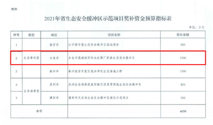 7月5日,省財政廳、省生態(tài)環(huán)境廳下發(fā)《關(guān)于下達(dá)2021年省生態(tài)安全緩沖區(qū)示范項目獎補(bǔ)資金的通知》(蘇財資環(huán)〔2021〕29號),給予太倉市1500萬元生態(tài)安全緩沖區(qū)示范項目獎補(bǔ)。這是太倉市繼2020年獲得“國家生態(tài)文明建設(shè)示范市”榮譽(yù)后,在生態(tài)文明建設(shè)工作方面再次獲得的兩項殊榮!