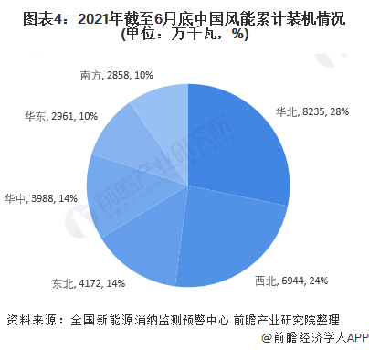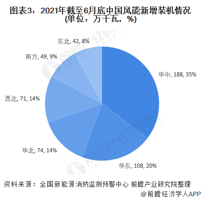 2021年1-6月,華中地區(qū)和華東地區(qū)的新增裝機容量較多,分別達到188萬千瓦和108萬千瓦。截止2021年6月底,華北地區(qū)和西北地區(qū)的風(fēng)能累計裝機容量占比超過全國一半,分別達到28%和24%。