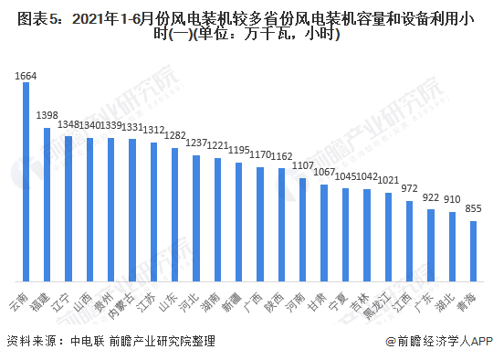 按照利用小時來看,2021年1-6月,云南、福建和遼寧的風(fēng)能利用小時最高;其中云南的利用小時突破1500小時,位列全國第一。并且有10個省市的風(fēng)能利用小時超過1200小時。