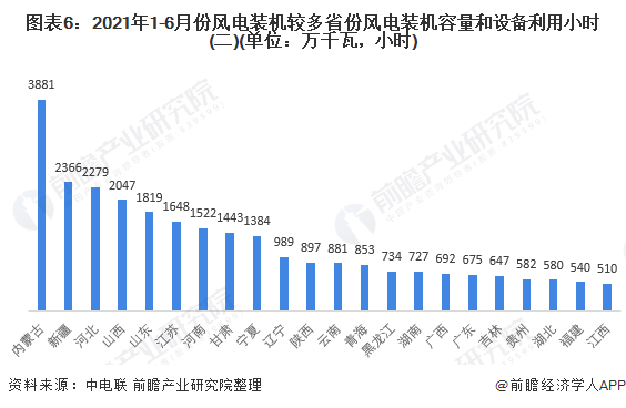 按照裝機容量來看,2021年1-6月,內(nèi)蒙古、新疆和河北的裝機容量位列全國前三;其中內(nèi)蒙古的風(fēng)能裝機容量突破3500萬千瓦,位列全國第一。并且有9個省市的風(fēng)能裝機容量突破1000萬千瓦。