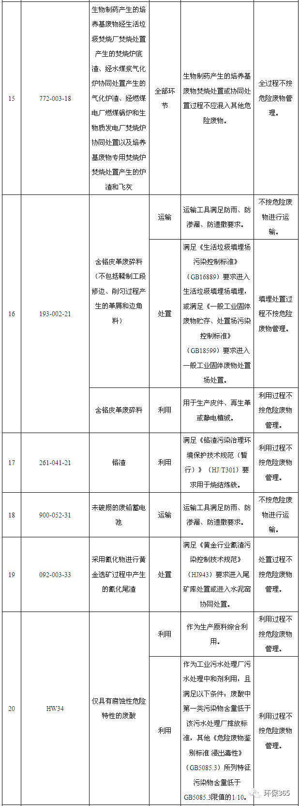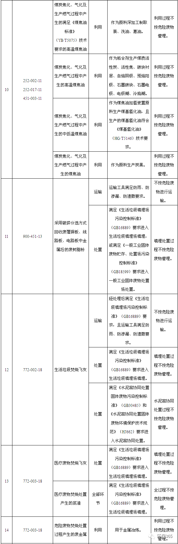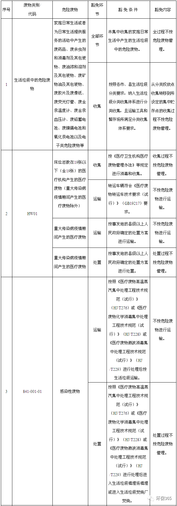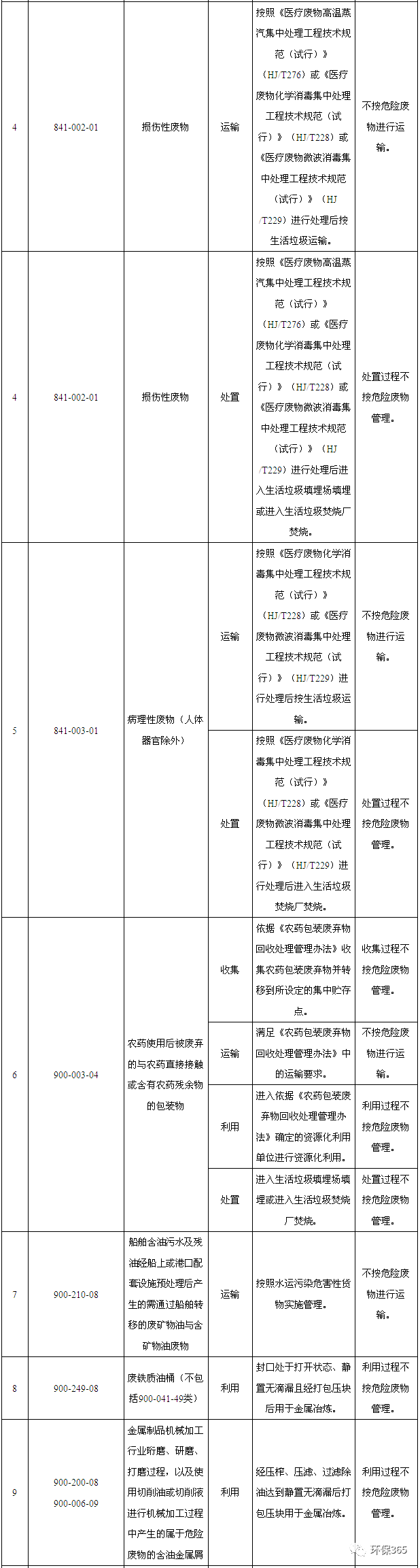 (1)家庭日常生活或者為日常生活提供服務(wù)的活動(dòng)中產(chǎn)生的廢藥品、廢殺蟲劑和消毒劑及其包裝物、廢油漆和溶劑及其包裝物、廢礦物油及其包裝物、廢膠片及廢像紙、廢熒光燈管、廢含汞溫度計(jì)、廢含汞血壓計(jì)、廢鉛蓄電池、廢鎳鎘電池和氧化汞電池以及電子類危險(xiǎn)廢物等未經(jīng)過集中收集的全部環(huán)節(jié)不按危險(xiǎn)廢物管理;按照各市、縣生活垃圾分類要求,納入生活垃圾分類收集體系進(jìn)行分類收集,且運(yùn)輸工具和暫存場所滿足分類收集體系要求的,從分類投放點(diǎn)收集轉(zhuǎn)移到所設(shè)定的集中貯存點(diǎn)的收集過程不按危險(xiǎn)廢物管理。(2)床位總數(shù)在19張以下(含19張)的醫(yī)療機(jī)構(gòu)產(chǎn)生的醫(yī)療廢物(重大傳染病疫情期間產(chǎn)生的醫(yī)療廢物除外)按《醫(yī)療衛(wèi)生機(jī)構(gòu)醫(yī)療廢物管理辦法》等規(guī)定進(jìn)行消毒和收集的,收集過程不按危險(xiǎn)廢物管理;轉(zhuǎn)運(yùn)車輛符合《醫(yī)療廢物轉(zhuǎn)運(yùn)車技術(shù)要求(試行)》(GB19217)要求的,不按危險(xiǎn)廢物進(jìn)行運(yùn)輸;重大傳染病疫情期間產(chǎn)生的醫(yī)療廢物,按事發(fā)地的縣級以上人民政府確定的處置方案進(jìn)行運(yùn)輸?shù)?,不按危險(xiǎn)廢物進(jìn)行運(yùn)輸;按事發(fā)地的縣級以上人民政府確定的處置方案進(jìn)行處置的,處置過程不按危險(xiǎn)廢物管理。(3)感染性廢物按照《醫(yī)療廢物高溫蒸汽集中處理工程技術(shù)規(guī)范(試行)》(HJ/T276)或《醫(yī)療廢物化學(xué)消毒集中處理工程技術(shù)規(guī)范(試行)》(HJ/T228)或《醫(yī)療廢物微波消毒集中處理工程技術(shù)規(guī)范(試行)》(HJ/T229)進(jìn)行處理后按生活垃圾運(yùn)輸?shù)?,不按危險(xiǎn)廢物進(jìn)行運(yùn)輸;按照《醫(yī)療廢物高溫蒸汽集中處理工程技術(shù)規(guī)范(試行)》(HJ/T276)或《醫(yī)療廢物化學(xué)消毒集中處理工程技術(shù)規(guī)范(試行)》(HJ/T228)或《醫(yī)療廢物微波消毒集中處理工程技術(shù)規(guī)范(試行)》(HJ/T229)進(jìn)行處理后進(jìn)入生活垃圾填埋場填埋或進(jìn)入生活垃圾焚燒廠焚燒的,處置過程不按危險(xiǎn)廢物管理。(4)損傷性廢物按照《醫(yī)療廢物高溫蒸汽集中處理工程技術(shù)規(guī)范(試行)》(HJ/T276)或《醫(yī)療廢物化學(xué)消毒集中處理工程技術(shù)規(guī)范(試行)》(HJ/T228)或《醫(yī)療廢物微波消毒集中處理工程技術(shù)規(guī)范(試行)》(HJ/T229)進(jìn)行處理后按生活垃圾運(yùn)輸?shù)?,不按危險(xiǎn)廢物進(jìn)行運(yùn)輸;按照《醫(yī)療廢物高溫蒸汽集中處理工程技術(shù)規(guī)范(試行)》(HJ/T276)或《醫(yī)療廢物化學(xué)消毒集中處理工程技術(shù)規(guī)范(試行)》(HJ/T228)或《醫(yī)療廢物微波消毒集中處理工程技術(shù)規(guī)范(試行)》(HJ/T229)進(jìn)行處理后進(jìn)入生活垃圾填埋場填埋或進(jìn)入生活垃圾焚燒廠焚燒的,處置過程不按危險(xiǎn)廢物管理。(5)病理性廢物(人體器官除外)按照《醫(yī)療廢物化學(xué)消毒集中處理工程技術(shù)規(guī)范(試行)》(HJ/T228)或《醫(yī)療廢物微波消毒集中處理工程技術(shù)規(guī)范(試行)》(HJ/T229)進(jìn)行處理后按生活垃圾運(yùn)輸?shù)?,不按危險(xiǎn)廢物進(jìn)行運(yùn)輸;按照《醫(yī)療廢物化學(xué)消毒集中處理工程技術(shù)規(guī)范(試行)》(HJ/T228)或《醫(yī)療廢物微波消毒集中處理工程技術(shù)規(guī)范(試行)》(HJ/T229)進(jìn)行處理后進(jìn)入生活垃圾焚燒廠焚燒的,處置過程不按危險(xiǎn)廢物管理。(6)農(nóng)藥使用后被廢棄的與農(nóng)藥直接接觸或含有農(nóng)藥殘余物的包裝物依據(jù)《農(nóng)藥包裝廢棄物回收處理管理辦法》收集并轉(zhuǎn)移到所設(shè)定的集中貯存點(diǎn)的,收集過程不按危險(xiǎn)廢物管理;滿足《農(nóng)藥包裝廢棄物回收處理管理辦法》中的運(yùn)輸要求的,不按危險(xiǎn)廢物進(jìn)行運(yùn)輸;進(jìn)入依據(jù)《農(nóng)藥包裝廢棄物回收處理管理辦法》確定的資源化利用單位進(jìn)行資源化利用的,利用過程不按危險(xiǎn)廢物管理;進(jìn)入生活垃圾填埋場填埋或進(jìn)入生活垃圾焚燒廠焚燒的,處置過程不按危險(xiǎn)廢物管理。(7)船舶含油污水及殘油經(jīng)船上或港口配套設(shè)施預(yù)處理后產(chǎn)生的需通過船舶轉(zhuǎn)移的廢礦物油與含礦物油廢物按照水運(yùn)污染危害性貨物實(shí)施管理的,不按危險(xiǎn)廢物進(jìn)行運(yùn)輸。(8)廢鐵質(zhì)油桶(不包括900-041-49類)封口處于打開狀態(tài)、靜置無滴漏且經(jīng)打包壓塊后用于金屬冶煉的,利用過程不按危險(xiǎn)廢物管理。(9)金屬制品機(jī)械加工行業(yè)珩磨、研磨、打磨過程,以及使用切削油或切削液進(jìn)行機(jī)械加工過程中產(chǎn)生的屬于危險(xiǎn)廢物的含油金屬屑經(jīng)壓榨、壓濾、過濾除油達(dá)到靜置無滴漏后打包壓塊用于金屬冶煉的,利用過程不按危險(xiǎn)廢物管理。(10)煤炭焦化、氣化及生產(chǎn)燃?xì)膺^程中產(chǎn)生的滿足《煤焦油標(biāo)準(zhǔn)》(YB/T5075)技術(shù)要求的高溫煤焦油作為原料深加工制取萘、洗油、蒽油的,利用過程不按危險(xiǎn)廢物管理。煤炭焦化、氣化及生產(chǎn)燃?xì)膺^程中產(chǎn)生的高溫煤焦油作為粘