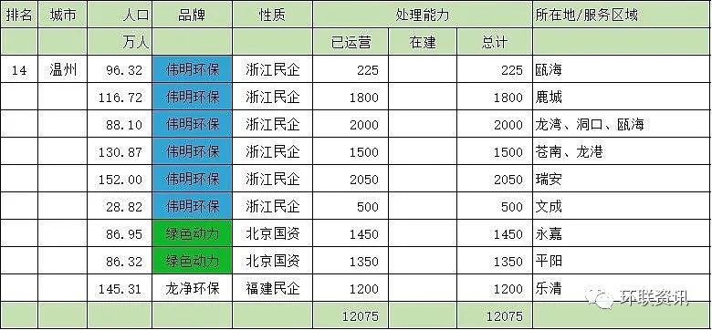 第十四名:溫州市(12075噸/天)