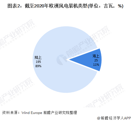 從風(fēng)電裝機(jī)類型來看,歐洲風(fēng)電發(fā)展以陸上風(fēng)電為主,截至2020年末,歐洲陸上風(fēng)電裝機(jī)量達(dá)195吉瓦,占?xì)W洲風(fēng)電裝機(jī)總量的89%。