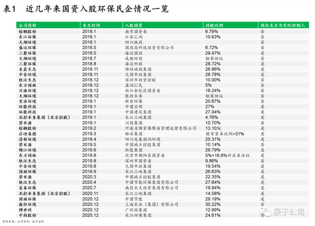 據(jù)不完全統(tǒng)計(jì),從2018年開始,頭部環(huán)保民營(yíng)企業(yè)“投身”國(guó)資的趨勢(shì)加快,從2018年到2020年,有超過34家民營(yíng)企業(yè)迎來國(guó)資的入股,超過50%的企業(yè)實(shí)際控制人變更為國(guó)資(見表1)。