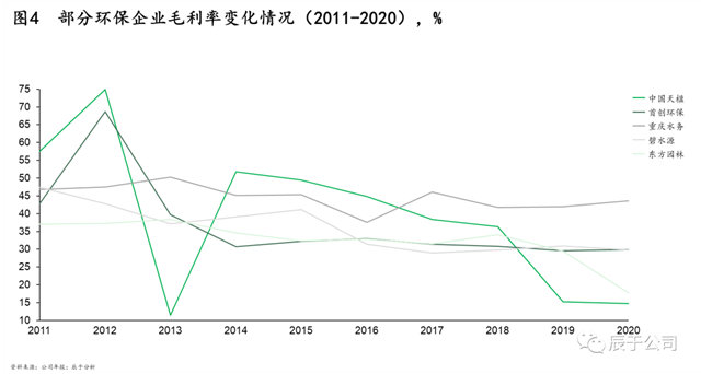 因此,地方政府一方面想辦法壓低項(xiàng)目盈利水平降低投入,一方面尋求其他“合法”融資渠道解困。近年來大型生態(tài)環(huán)保企業(yè)的盈利水平逐步下降印證了項(xiàng)目盈利降低的趨勢(shì)(見圖),盈利就幾個(gè)點(diǎn),融資成本極低的大型國(guó)企、央企在競(jìng)爭(zhēng)中處于優(yōu)勢(shì),幾個(gè)點(diǎn)的融資成本決定了項(xiàng)目的成與否;尋找融資渠道下,地方生態(tài)環(huán)保集團(tuán)應(yīng)運(yùn)而生,對(duì)跨市統(tǒng)籌、投資公益性回報(bào)比較差的項(xiàng)目等,將起到積極的作用。
