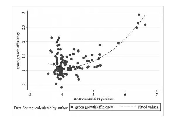 本文通過采用M-L指數(shù)模型測算了我國制造業(yè)部門的綠色增長率,并構建計量經(jīng)濟學模型實證分析了環(huán)境規(guī)制對綠色增長率的影響。研究發(fā)現(xiàn):(1)環(huán)境規(guī)制對制造業(yè)綠色增長率的影響呈現(xiàn)出“U”型關系。通過對于曲線的數(shù)值計算,作者進一步發(fā)現(xiàn),整體而言,環(huán)境規(guī)制對制造業(yè)的促進作用尚未顯現(xiàn)。(2)通過將綠色增長效率進一步分解為技術效率和技術進步指數(shù)后,文章進一步發(fā)現(xiàn)環(huán)境規(guī)制政策分別與技術效率和技術進步指數(shù)呈倒“U”型和“U”型關系。(3)異質(zhì)性研究表明,“U”型關系曲線只顯著存在于高能耗產(chǎn)業(yè)和高、中污染行業(yè)中。并且數(shù)值計算顯示,針對高耗能、高污染行業(yè)的環(huán)境監(jiān)管力度已超過閾值(“U”形曲線的最低點),即環(huán)境規(guī)制政策有力促進了這些行業(yè)的綠色轉(zhuǎn)型。
