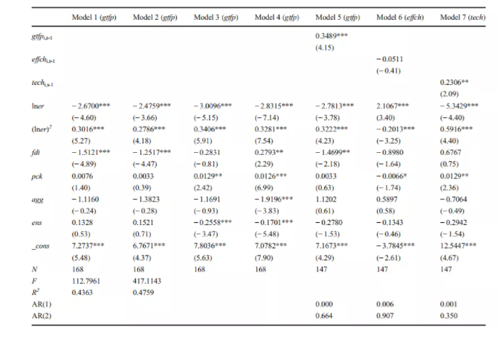 表1中的(1)-(4),作者分別采用了固定效應、雙向固定效應、隨機效應和FGLS進行估計,模型(5)-(7)顯示了基于系統(tǒng)GMM方法的估計結果。經(jīng)過模型設定的一系列檢驗,作者以系統(tǒng)GMM的估計結果討論了實證檢驗的結果。從模型(5)來看,lner系數(shù)為負,而二次項為正,并且都通過了顯著性檢驗。證明了環(huán)境規(guī)制與制造業(yè)綠色增長之間存在的“U”型關系。根據(jù)估計系數(shù),當環(huán)境規(guī)制強度為4.6時,曲線達到最小值。另外,根據(jù)模型(6)和模型(7)的回歸結果來看,環(huán)境規(guī)制對技術進步的影響呈“U”形關系,而對于技術效率指數(shù),則呈倒“U”形關系。