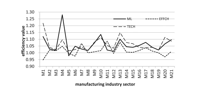 圖1展示了制造業(yè)的總體ML指數(shù)分布趨勢。根據(jù)分解結果可以看出,技術進步是推動增長的主要因素。具體行業(yè)中,煙草制造業(yè)(M4)的指數(shù)值最高,其次是“環(huán)境友好型”行業(yè),如藥品制造業(yè)(M10)和測量儀器業(yè)(M21)。從投入產(chǎn)出的角度來看,這些部門的特點是投入低且非期望產(chǎn)出少。在指數(shù)值最低的三個行業(yè)部門中,主要是污染物排放較嚴重的行業(yè)。例如,排放大量工業(yè)廢水的紡織品制造行業(yè)(M5)、產(chǎn)生高廢氣排放的石油加工、焦化和核燃料加工行業(yè)(M8)以及產(chǎn)生大量工業(yè)固體廢物的非金屬礦物行業(yè)(M12)。