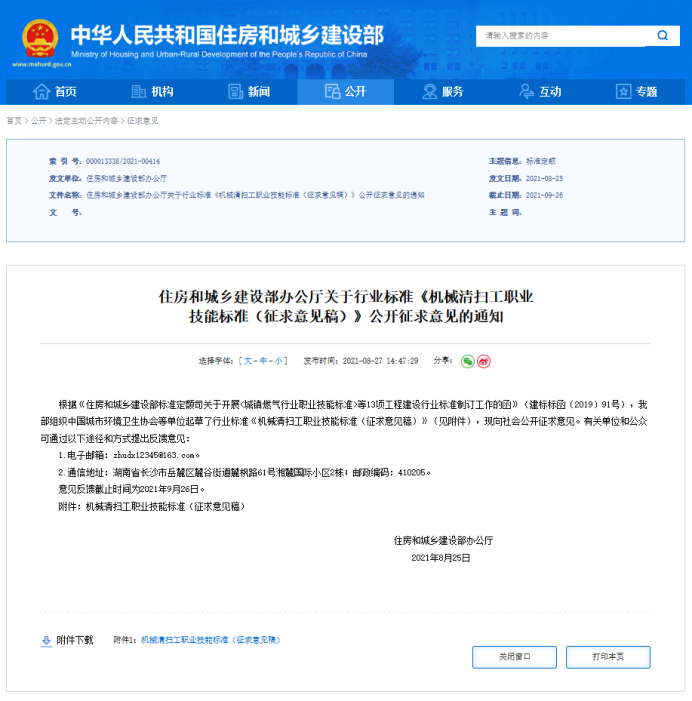 近日,從住房和城鄉(xiāng)建設部官網(wǎng)獲悉,住房和城鄉(xiāng)建設部辦公廳正依據(jù)《住房和城鄉(xiāng)建設部標準定額司關于開展等13項工程建設行業(yè)標準制訂工作的函》(建標標函〔2019〕91號),就《保潔員職業(yè)技能標準》《機械清掃工職業(yè)技能標準》《垃圾處理工職業(yè)技能標準》等進行意見征求。其中,《機械清掃工職業(yè)技能標準(征求意見稿)》由中國城市環(huán)境衛(wèi)生協(xié)會等單位起草,《保潔員職業(yè)技能標準(征求意見稿)》由廣東省環(huán)境衛(wèi)生協(xié)會等單位起草,《垃圾處理工職業(yè)技能標準(征求意見稿)》由華中科技大學等單位起草。根據(jù)上述三則征求意見稿的精神,納入三則征求意見稿的環(huán)衛(wèi)工種,其從業(yè)人員有望獲得職業(yè)技能認定。下列環(huán)衛(wèi)工種有望獲得職業(yè)技能認定納入《保潔員職業(yè)技能標準》征求意見的環(huán)衛(wèi)工種,包括清掃保潔工、公廁保潔員、水域保潔員、高空外墻清洗員;納入《機械清掃工職業(yè)技能標準》征求意見的環(huán)衛(wèi)工種,包括機械掃路工、機械沖洗工、機械疏通工、機械除雪工、船舶輪機工(員);納入《垃圾處理工職業(yè)技能標準》的環(huán)衛(wèi)工種,包括生活垃圾填埋處理工、生活垃圾焚燒處理工、生活垃圾堆肥處理工、廚余垃圾處理工、大件垃圾處理工、園林垃圾處理工、建筑(裝修)垃圾處理工、糞便處理工、垃圾分選工。環(huán)衛(wèi)工種由低到高分為哪些等級?根據(jù)三則征求意見稿,環(huán)衛(wèi)從業(yè)人員日后或可根據(jù)自己所從事的工作屬性,通過申報和考核程序獲得職業(yè)技能等級評定,其中:保潔員職業(yè)技能等級由低到高可分為:職業(yè)技能五級(初級工)、職業(yè)技能四級(中級工)、職業(yè)技能三級(高級工);機掃工職業(yè)技能等級由低到高可分為五級:職業(yè)技能五級(初級工)、職業(yè)技能四級(中級工)、職業(yè)技能三級(高級工)、職業(yè)技能二級(技師)和職業(yè)技能一級(高級技師);垃圾處理工職業(yè)技能等級由低到高可分為:職業(yè)技能五級、職業(yè)技能四級、職業(yè)技能三級、職業(yè)技能二級和職業(yè)技能一級。 鼓勵環(huán)衛(wèi)工人通過進修更高等級的職業(yè)資格認定征求意見稿鼓勵環(huán)衛(wèi)工人通過進修獲得使用相關機械的資質(zhì),或者通過進修提升文化水平獲得更高等級的職業(yè)資格認定。如最高等級只到三級的保潔員,可按照環(huán)境衛(wèi)生服務行業(yè)其他工種的職業(yè)技能要求申報更高等級;如具有大專及以上本專業(yè)或相關專業(yè)畢業(yè)證書,并取得本職業(yè)或相關職業(yè)四級職業(yè)資格證書后,累計從事本職業(yè)或相關職業(yè)工作2年(含)以上者,可申報垃圾處理工職業(yè)技能三級;具有大專及以上本專業(yè)或相關專業(yè)畢業(yè)證書,累積從事本職業(yè)工作1年(含)及以上,可申報機掃工職業(yè)技能三級(高級工)。據(jù)悉,隨著國內(nèi)各城市的發(fā)展,不少城市近年來紛紛鼓勵環(huán)衛(wèi)工人通過提升職業(yè)技能,引導環(huán)衛(wèi)工人從單純使用簡單工具進行路面保潔轉(zhuǎn)型為可使用或駕駛各類機械參與更精細化的保潔工作,也鼓勵有條件的環(huán)衛(wèi)工人通過進修文化課獲得更高等的學位轉(zhuǎn)型為管理人員。備注:以上部分內(nèi)容節(jié)選自羊城派《這些環(huán)衛(wèi)工種擬進行職業(yè)技能認定!未來更有奔頭》。關于行業(yè)標準《機械清掃工職業(yè)技能標準根據(jù)《住房和城鄉(xiāng)建設部標準定額司關于開展<城鎮(zhèn)燃氣行業(yè)職業(yè)技能標準>等13項工程建設行業(yè)標準制訂工作的函》(建標標函〔2019〕91號),我部組織中國城市環(huán)境衛(wèi)生協(xié)會等單位起草了行業(yè)標準《機械清掃工職業(yè)技能標準(征求意見稿)》(見附件),現(xiàn)向社會公開征求意見。有關單位和公眾可通過以下途徑和方式提出反饋意見:1.電子郵箱:zhudx12345@163.com。2.通信地址:湖南省長沙市岳麓區(qū)麓谷街道麓楓路61號湘麓國際小區(qū)2棟;郵政編碼:410205。附件:機械清掃工職業(yè)技能標準(征求意見稿)《機械清掃工職業(yè)技能標準(征求意見稿)》下載地址http://219.142.101.111/gongkai/fdzdgknr/zqyj/202108/20210827_761824.html根據(jù)《住房和城鄉(xiāng)建設部標準定額司關于開展<城鎮(zhèn)燃氣行業(yè)職業(yè)技能標準>等13項工程建設行業(yè)標準制訂工作的函》(建標標函〔2019〕91號),我部組織廣東省環(huán)境衛(wèi)生協(xié)會等單位起草了行業(yè)標準《保潔員職業(yè)技能標準(征求意見稿)》(見附件),現(xiàn)向社會公開征求意見。有關單位和公眾可通過以下途徑和方式提出反饋意見:2.通信地址:廣州市天河區(qū)先烈東路121號3號辦公樓3樓;郵政編碼:510500。http://219.142.101.111/gongkai/fdzdgknr/zqyj/202108/20210827_761823.html關于行業(yè)標準《垃圾處理工職業(yè)技能標準根據(jù)《住房和城鄉(xiāng)建設部標準定額司關于開展<城鎮(zhèn)燃氣行業(yè)職業(yè)技能標準>等13項工程建設行業(yè)標準制訂工作的函》(建標標函〔2019〕91號),我部組織華中科技大學等單位起草了行業(yè)標準《垃圾處理工職業(yè)技能標準(征求意見稿)》(見附件),現(xiàn)向社會公開征求意見。有關單位