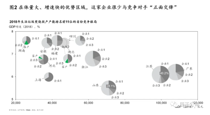 這是我們服務(wù)過的一家全國性生態(tài)環(huán)保企業(yè)的區(qū)域布局(見圖2,為保護(hù)隱私,數(shù)據(jù)已做處理),可以看到,在那些規(guī)模大、增速快的地區(qū),這家企業(yè)的市場占有率很低,盡管它的規(guī)模已位居全國前20強(qiáng)。這種“劍走偏鋒”其實(shí)反映出生態(tài)環(huán)保市場競爭的無奈:時至今日,“關(guān)系”似乎仍然是決定項(xiàng)目能否拿到手的最重要因素,技術(shù)、產(chǎn)品、運(yùn)營、品牌都不重要,但唯獨(dú)不能沒有關(guān)系。上述的這些區(qū)域正是這家企業(yè)的“關(guān)系”所在。