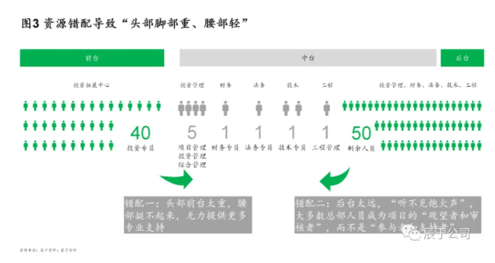 不難發(fā)現(xiàn),近年來一些企業(yè)開始“招兵買馬”,大量招聘投資拓展人員,這對于企業(yè)提高投資拓展能力自然是好事。不過我們也注意到,一些企業(yè)在投資相關(guān)的人員配置上卻不盡合理:他們通常把大量投資拓展人員“撒在前線”,同時建立“大后臺”,與投資相關(guān)的投管、財務(wù)、法務(wù),甚至技術(shù)、工程、運(yùn)營等人員主要負(fù)責(zé)項(xiàng)目質(zhì)量把關(guān)和風(fēng)險管控,只有少量人員在中臺為前臺提供“彈藥”和支持(見圖3)。這種“頭重腳重”帶來兩個“錯配”,一是頭部前臺太重,腰部挺不起來,無力提供更多專業(yè)支持;二是腳部后臺太遠(yuǎn),“聽不見炮火聲”,大多數(shù)人成為項(xiàng)目的“觀望者和審核者”,而不是“參與者和支持者”。