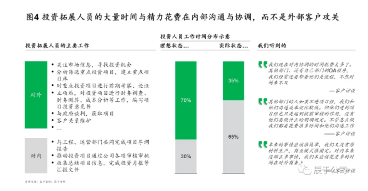 理想狀態(tài)下,對外對內(nèi)工作的時間分配比例應(yīng)該是7:3,甚至更高也不為過,但現(xiàn)實(shí)往往相反,由于內(nèi)部協(xié)同效率不高、流程繁冗、“人治”問題嚴(yán)重,我們發(fā)現(xiàn)一些投資拓展人員更多的時間與精力花費(fèi)在內(nèi)部溝通與協(xié)調(diào),而不是外部客戶攻關(guān)(見圖4)。造成這種現(xiàn)象的原因,表面看上去是內(nèi)部流程繁瑣,決策鏈條冗長,實(shí)則是內(nèi)部沒有形成一以貫之以市場為導(dǎo)向、以項(xiàng)目為核心的理念文化。平時大多只是喊喊口號而已,并未真正付諸行動。