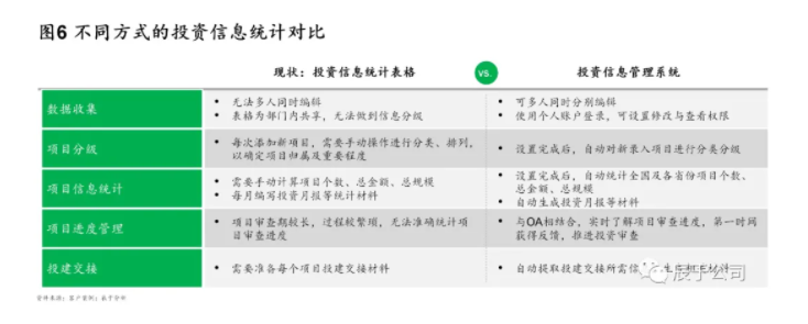 此外,我國生態(tài)環(huán)保產(chǎn)業(yè)數(shù)字化滲透率尚處于較低水平,即使是頭部企業(yè),也僅是在財務(wù)、行政、人力資源、工程等條線進(jìn)行了IT系統(tǒng)建設(shè),投資管理的IT系統(tǒng)建設(shè)很少,更別提利用大數(shù)據(jù)、機(jī)器學(xué)習(xí)、人工智能等先進(jìn)技術(shù)為投資決策提供支持了,不管是數(shù)據(jù)收集、還是項(xiàng)目分級、信息統(tǒng)計、進(jìn)度管理、投建交接等工作,基本依靠手動操作,效率低下且容易出錯(見圖6)。