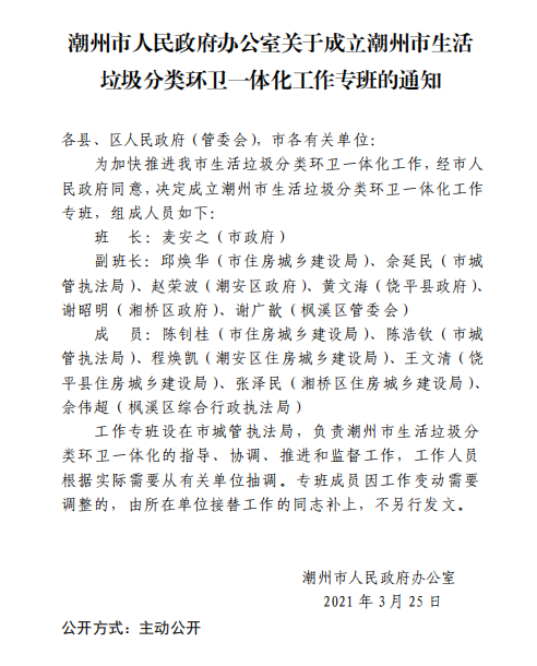 此外,2021年3月份,潮州市人民政府辦公室就發(fā)布了《關(guān)于成立潮州市生活垃圾分類環(huán)衛(wèi)一體化工作專班的通知》,提到,工作專班設(shè)在市城管執(zhí)法局,負責(zé)潮州市生活垃圾分類環(huán)衛(wèi)一體化的指導(dǎo)、協(xié)調(diào)、推進和監(jiān)督工作。