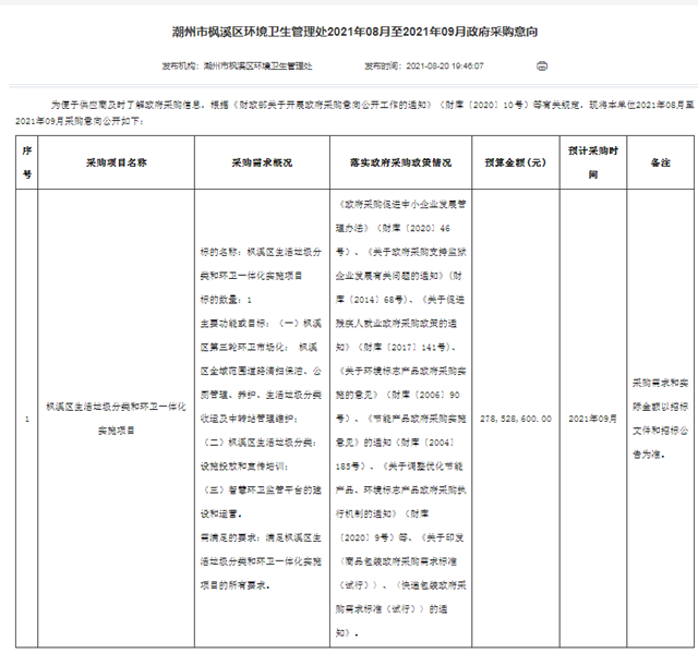 即將在9月份采購的湘橋區(qū)生活垃圾分類和環(huán)衛(wèi)一體化實施項目和楓溪區(qū)生活垃圾分類和環(huán)衛(wèi)一體化實施項目,總投資超10億元,這么高額的預(yù)算費用用來用于潮州市環(huán)衛(wèi)一體化改革,充分說明了潮州市政府對環(huán)衛(wèi)一體化改革的重視程度之高,最終誰能奪得兩項目,中國固廢網(wǎng)將持續(xù)關(guān)注——