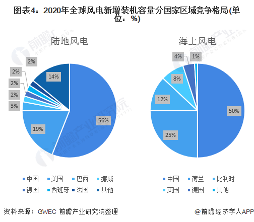 從2020年陸地風(fēng)電新增裝機容量分國家情況來看,中國新增裝機容量占比56%,排名第一,其次為美國占比19%。從海上風(fēng)電分國家情況來看,中國新增裝機容量占比50%,仍然排名第一;荷蘭和比利時占比分別為25%和12%,位列第二和第三。