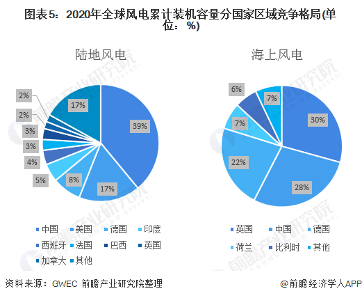 從2020年陸地風(fēng)電累計裝機容量分國家情況來看,中國累計裝機容量占比39%,排名第一,其次為美國占比17%。從海上風(fēng)電分國家情況來看,英國累計裝機容量占比29%,排名第一;中國和德國占比分別為28%和22%,位列第二和第三。