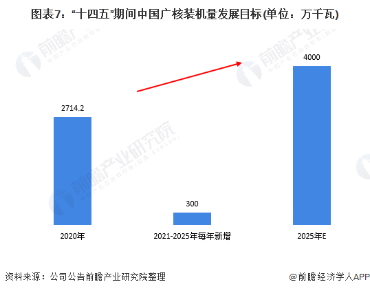 根據(jù)《十四五規(guī)劃和2035年愿景目標綱要》,“十四五”期間,我國核電運行裝機容量達到7000萬千瓦。中國廣核作為我國核電行業(yè)的龍頭企業(yè),也提出了其十四五發(fā)展目標:“十四五”期間,中國廣核將保持每年300萬千瓦以上發(fā)展速度,預(yù)計到“十四五”末,中廣核境內(nèi)新能源在運裝機總?cè)萘繉⑼黄?000萬千瓦。