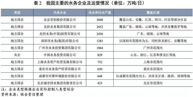 水務(wù)企業(yè)類型和競爭格局方面,目前,我國行業(yè)內(nèi)分布的水務(wù)企業(yè)大致可分為三種,國有水務(wù)企業(yè)(央企和地方國企)、外商投資水務(wù)企業(yè)和民營水務(wù)企業(yè)。其中,國有地方水務(wù)企業(yè)較為普遍,多為所在地方原事業(yè)單位改制形成,其業(yè)務(wù)結(jié)構(gòu)相對單一,以服務(wù)所在區(qū)域供水和污水處理為主業(yè),區(qū)域壟斷性突出,是水務(wù)行業(yè)的主力軍。部分實力較強的區(qū)域(北京、深圳、成都、重慶等地)地方國有水務(wù)企業(yè)和央屬水務(wù)企業(yè)基于雄厚的股東背景、資金實力和技術(shù)水平,通過并購、合資、參控股、BOT和PPP等手段在全國范圍內(nèi)或國外異地擴(kuò)張,獲取供水和污水處理業(yè)務(wù)特許經(jīng)營權(quán),并通過水務(wù)衍生行業(yè)拓展成為投資型綜合水務(wù)企業(yè),對原區(qū)域內(nèi)地方水務(wù)企業(yè)產(chǎn)生一定競爭。外資水務(wù)企業(yè)往往擁有水務(wù)技術(shù)和較高的管理水平,但進(jìn)入中國水務(wù)市場數(shù)量較少。民營水務(wù)企業(yè)所占市場份額較小,主要通過PPP模式在污水處理和水環(huán)境治理領(lǐng)域參與競爭,面臨較大投資和回款壓力。