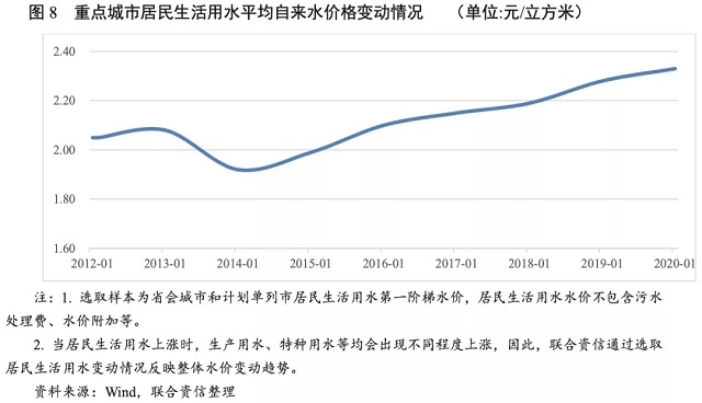 近年來,我國重點城市居民生活用水價格整體呈現(xiàn)小幅上漲趨勢,2020年,部分城市居民生活用水價格進(jìn)一步調(diào)升;水資源匱乏城市水價格較高;伴隨著水價改革的推進(jìn)及節(jié)水政策指導(dǎo)下水價調(diào)控作用的發(fā)揮,預(yù)期城市供水價格未來溫和上漲。