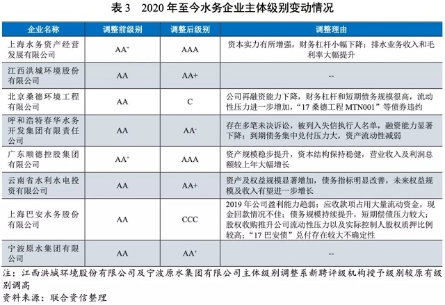 2020年以來,69家存續(xù)發(fā)債水務(wù)樣本企業(yè)中有8家主體信用級別發(fā)生了變化,其中5家公司級別上調(diào),3家公司級別下調(diào)。