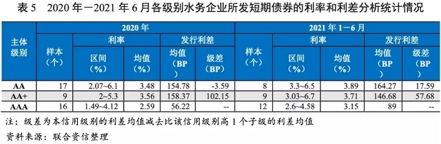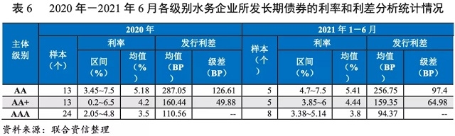 從發(fā)行利差看,水務(wù)企業(yè)債券不同級別、不同期限發(fā)行利差呈波動態(tài)勢。其中,AAA主體發(fā)行利差波動較小,其他企業(yè)發(fā)行利率區(qū)間及利差波動較大,主要系水務(wù)企業(yè)樣本企業(yè)偏少,市場認(rèn)可度差異較為明顯,不同時間段發(fā)行企業(yè)的差異對發(fā)行利率及利差影響很大。2020年及2021年1——6月,水務(wù)企業(yè)債券不同級別、不同期限發(fā)行利差詳見下表。