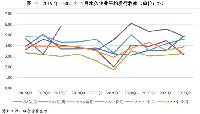 2019年至2021年6月,除AA級別水務(wù)企業(yè)債券發(fā)行利率波動上升外,其他級別水務(wù)企業(yè)所發(fā)行不同期限債券利率均波動下降。2020年,水務(wù)企業(yè)短期債券的平均發(fā)行利率為3.16%,較上年的3.80%大幅下降。2021年1——6月,水務(wù)企業(yè)短期債券平均發(fā)行利率(3.53%)較2020年有所上升,且較上年同期平均發(fā)行利率(2.97%)也有所上升。