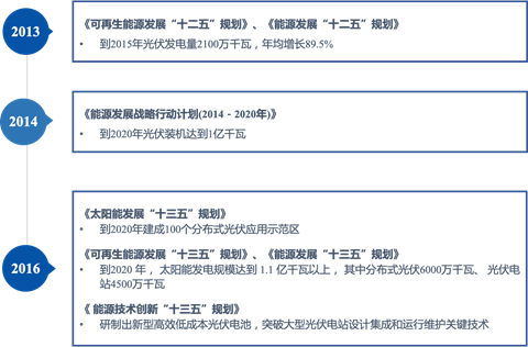 此外,在2013年至2016年期間,中國(guó)可再生能源發(fā)展相關(guān)規(guī)劃陸續(xù)出臺(tái),從頂層目標(biāo)和頂層政策設(shè)計(jì)的層面,為作為中國(guó)可再生能源主力的光伏產(chǎn)業(yè)發(fā)展提供了長(zhǎng)期的政策保障。在相關(guān)規(guī)劃中,中國(guó)光伏發(fā)電相關(guān)目標(biāo)逐步提升,《可再生能源發(fā)展“十二五”規(guī)劃》提出到2015年,年光伏發(fā)電量提升至2100萬(wàn)千瓦;《能源發(fā)展戰(zhàn)略行動(dòng)計(jì)劃(2014-2020年)》提出到2020年光伏裝機(jī)達(dá)到1億千瓦;《可再生能源發(fā)展“十三五”規(guī)劃》等將2020年目標(biāo)進(jìn)一步提升至太陽(yáng)能發(fā)電規(guī)模1.1億千瓦以上,并建成100個(gè)分布式光伏應(yīng)用示范區(qū)。政策目標(biāo)的明確和不斷提升,為中國(guó)光伏產(chǎn)業(yè)尤其是光伏應(yīng)用市場(chǎng)的發(fā)展提供了廣闊市場(chǎng)前景和空間。