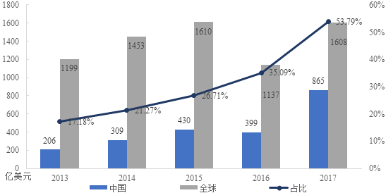 圖12:中國(guó)及全球光伏產(chǎn)業(yè)投資(2013-2017年)