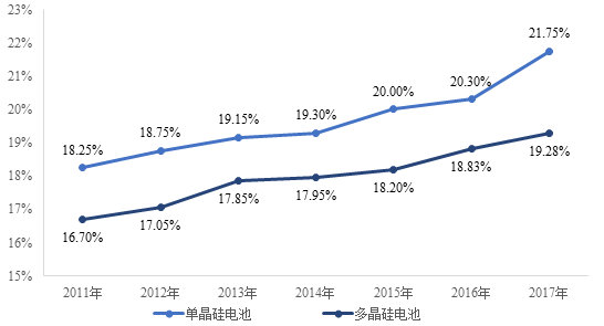 晶硅電池作為目前太陽(yáng)能電池的主流產(chǎn)品(另一類型為薄膜電池),可進(jìn)一步細(xì)分為單晶硅電池和多晶硅電池,其中,光電轉(zhuǎn)換效率是光伏電池路線選擇的核心問(wèn)題。單晶硅在自然界中儲(chǔ)量豐富,N型單晶硅具有雜質(zhì)少、純度高、電阻率容易控制等優(yōu)勢(shì)。[20]1954年美國(guó)Bell實(shí)驗(yàn)室首次研發(fā)出光電轉(zhuǎn)換效率6%的單晶硅電池,之后全球相關(guān)研究機(jī)構(gòu)開(kāi)始探索單晶硅的制備技術(shù)和器件結(jié)構(gòu),2009年澳大利亞新南威爾士大學(xué)宣布其單晶硅電池光電轉(zhuǎn)換效率達(dá)到25%,成為單晶硅電池技術(shù)研發(fā)的里程碑,2014年,日本Panasonic、美國(guó)SunPower等企業(yè)相繼將單晶硅電池轉(zhuǎn)換效率提升至25%以上。從中國(guó)國(guó)內(nèi)技術(shù)發(fā)展看,兩類晶硅電池的平均轉(zhuǎn)換效率均呈逐年上升趨勢(shì),但單晶硅電池轉(zhuǎn)換效率普遍比多晶硅電池高1~2個(gè)百分點(diǎn),更具優(yōu)勢(shì)。2017年,中國(guó)單晶硅電池和多晶硅電池平均光電轉(zhuǎn)換效率分別達(dá)21.75%、19.28%。[212]