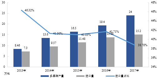 圖6:中國(guó)多晶硅產(chǎn)量及進(jìn)口量(2013-2017年)