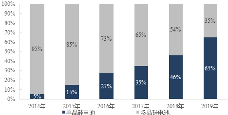 隨著單晶硅電池技術(shù)進(jìn)步生產(chǎn)成本下降,以及政府政策的大力支持,2014年至2019年期間,中國(guó)單晶硅電池市場(chǎng)份額自5%、大幅增加至65%,[28]根據(jù)工信部發(fā)布的《中國(guó)光伏路線圖(2016版)》,預(yù)計(jì)到2025年單晶市場(chǎng)份額將大幅提高至48%左右[29],截至2019年底,單晶市場(chǎng)占有率已遠(yuǎn)超該比例。