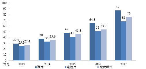 這一時(shí)期,中國(guó)國(guó)內(nèi)光伏應(yīng)用市場(chǎng)的啟動(dòng)和發(fā)展在一定程度上替代了之前的國(guó)際市場(chǎng)需求,支持中國(guó)光伏制造企業(yè)逐步恢復(fù)。2013年至2017年期間,中國(guó)硅片、電池片,以及光伏組件產(chǎn)量持續(xù)大幅增加,年均增長(zhǎng)率分別達(dá)48.73%、42.73%,以及44.34%。[15] 2017年,中國(guó)硅片產(chǎn)量87吉瓦,在全球占比83%,世界前10硅片生產(chǎn)企業(yè)中,中國(guó)企業(yè)9家;太陽(yáng)能電池片產(chǎn)量約68吉瓦,約占全球總產(chǎn)量的68%;晶硅電池組件產(chǎn)量76吉瓦,全球占比69%。[16]