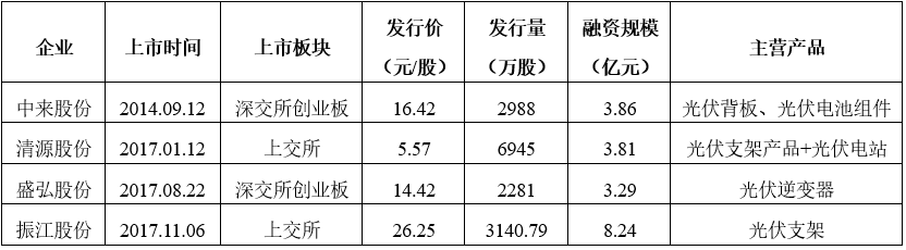 2013年至2017年期間,共有4家光伏制造企業(yè)在上交所及深交所創(chuàng)業(yè)版上市,融資金額均在3億元以上。從企業(yè)類型看,上市企業(yè)主營(yíng)產(chǎn)品集中于光伏背板、光伏逆變器、光伏支架等產(chǎn)品,這與2013年以來(lái)中國(guó)光伏應(yīng)用市場(chǎng)的發(fā)展密不可分,下游光伏電站數(shù)量逐漸增多,項(xiàng)目規(guī)模不斷擴(kuò)大,電站建設(shè)需要的光伏組件、逆變器、支架等光伏產(chǎn)品需求隨之增長(zhǎng),相關(guān)光伏制造企業(yè)得以快速發(fā)展,滿足A股IPO上市條件。從上市時(shí)間看,這一時(shí)期光伏制造企業(yè)主要集中在2017年上市,2017年作為中國(guó)A股IPO大年,整體發(fā)行量創(chuàng)歷史新高,相較于2016年成功發(fā)行248家企業(yè),2017年上市企業(yè)共420家,同比增長(zhǎng)約69%,[39]整體較為火熱的發(fā)行市場(chǎng)為光伏制造企業(yè)IPO上市提供了較為良好的市場(chǎng)環(huán)境,助推了相關(guān)企業(yè)在資本市場(chǎng)獲得股權(quán)融資。