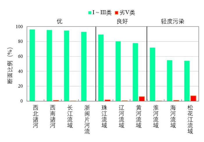 圖4 1-7月七大流域和西南、西北諸河及浙閩片河流水質(zhì)類別比例