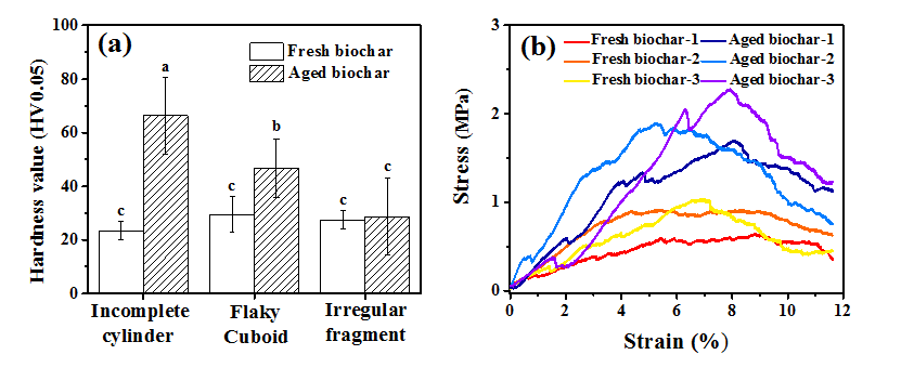 The results suggested the improvement of biochar particles’ mechanical strength after the field aging process, which would benefit the sequestration of particle internal structure and substances. The improvement of compressive strength of the aged biochar particles indicates that they might be able to withstand a higher mechanical pressure than the fresh biochar particles, leading to relative lower potential environmental risks, e.g., less fragmentation, less surface carbon loss, and more benefits for the microbial communities in the biochar particles.圖4. 機(jī)械性能分析