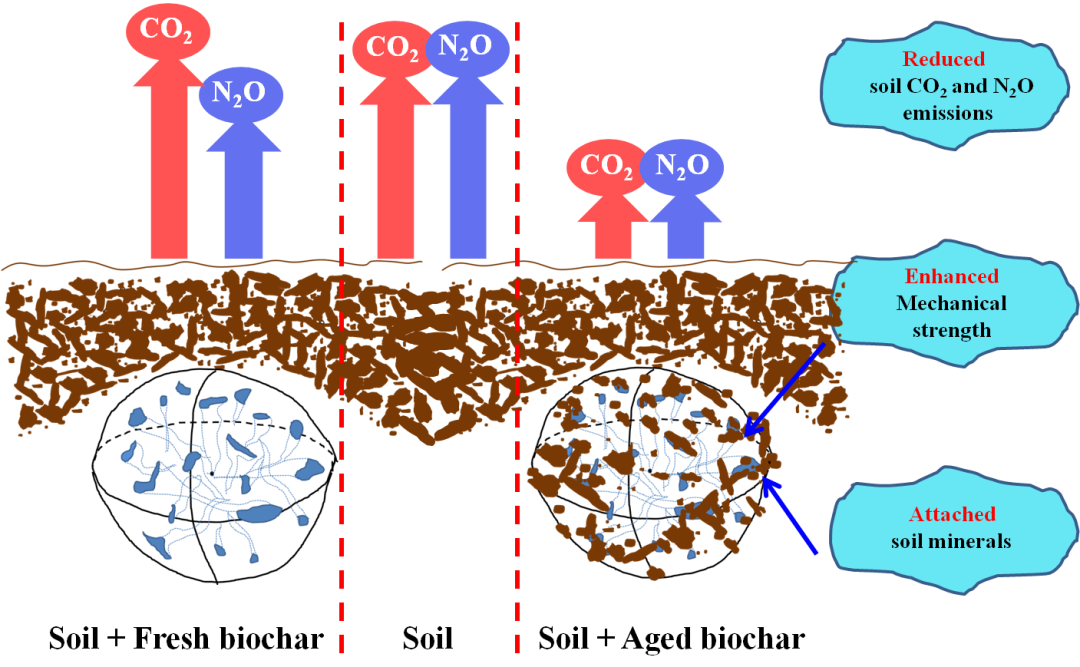田間老化使生物炭表面積累礦物質(zhì),形成有機(jī)-礦物復(fù)合體,從而增強(qiáng)顆粒物理穩(wěn)定性(如機(jī)械強(qiáng)度),顯著減少土壤CO2和N2O排放。因此新鮮生物炭使用之前,通過人為或自然的方法去除不穩(wěn)定組分及構(gòu)建富含有機(jī)-礦物復(fù)合體的保護(hù)界面,對(duì)于增強(qiáng)其在土壤中固碳減排潛力具有重要意義。