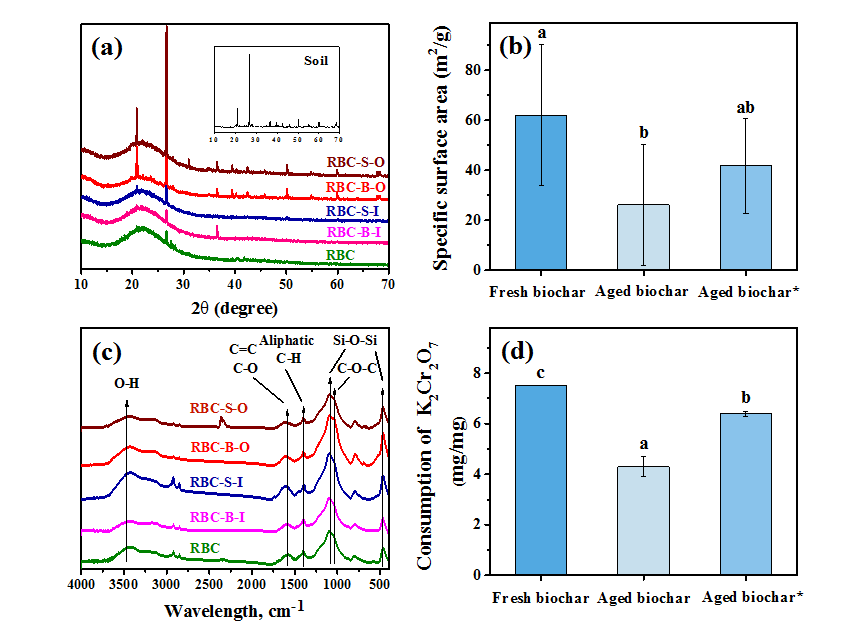 (a) XRD pattern, (b) SSA, (c) FTIR spectra, and (d) Result of Oxidation experiment. (“Aged biochar*” was abbreviated for “Aged biochar with surface removed”)