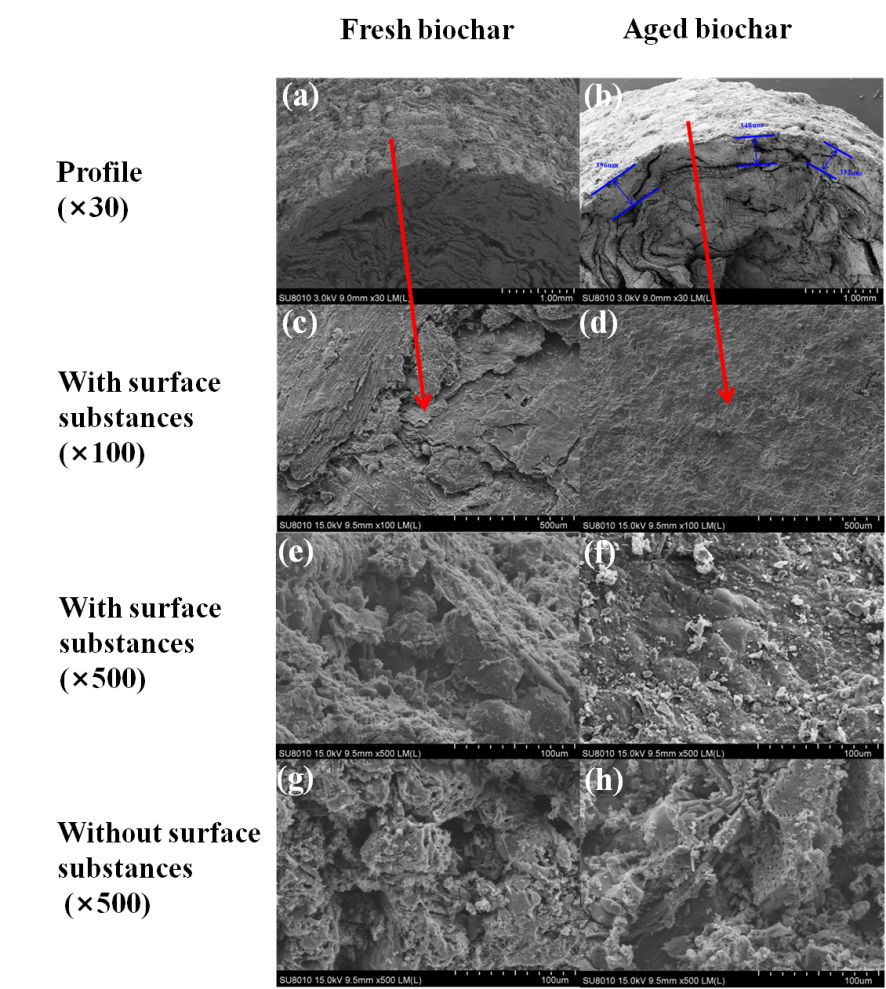 The fresh biochar exposed a wrinkled surface with cracks and channels (Fig. 1a, 1c, and 1e). In contrast, the aged biochar showed an observable covering on the surface (Fig. 1b). In the image with large magnifications (500 times) (Fig. 1f), the surface of aged biochar was observed to attach with a lot of fine particles, blocking the cracks and channels that were observed on the fresh biochar’s surface (Fig. 1e). After the removal of the surface substances, both the fresh and aged biochar showed a surface with cracks and channels (Fig. 1g and 1h).圖1. 生物炭顆粒表面掃描電鏡圖