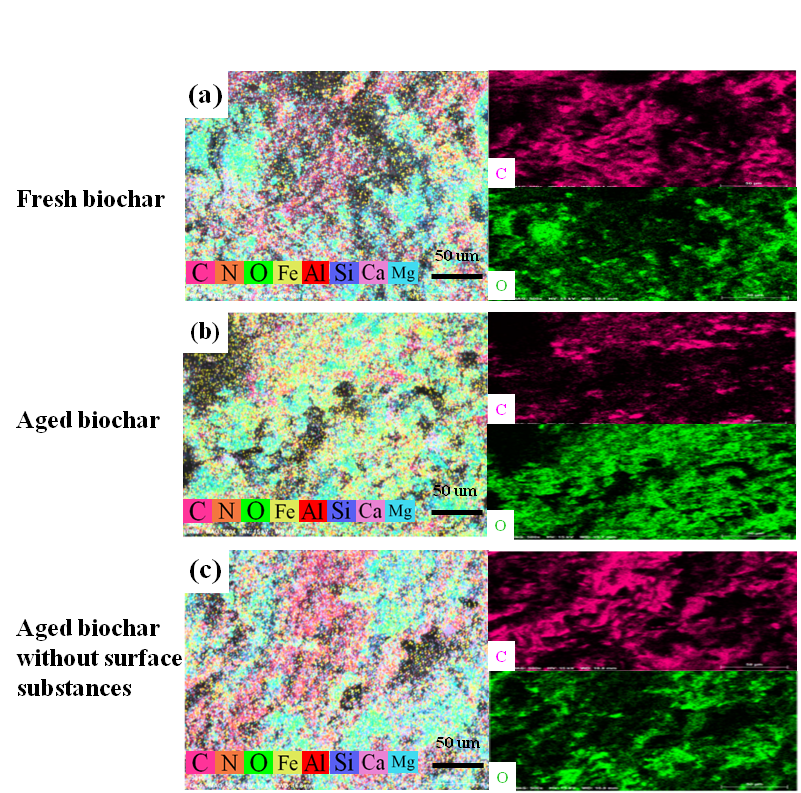 The SEM-EDS results further indicated that the contents of Si, Al, Fe, and O elements on the surface of aged biochar were significantly increased, as compared to those on fresh biochar which means that the aged biochar was attached with soil minerals (e.g., SiO2). Moreover, the surface contents of soil mineral elements (Si, Al, and Fe) on the aged biochar were decreased after scraping the surface substances.圖2. 生物炭表面元素X射線能譜分析圖