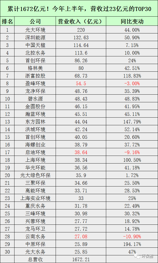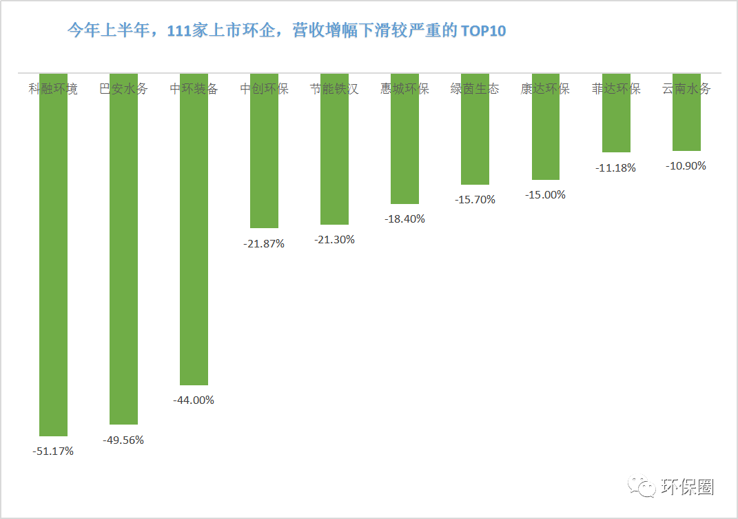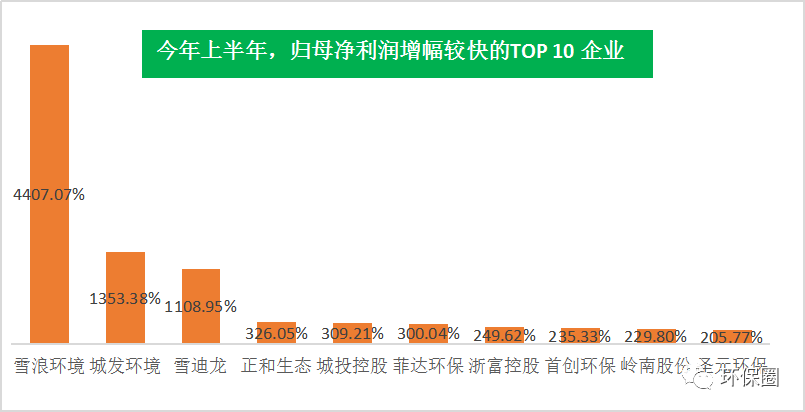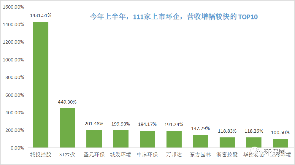 營收變動(dòng)幅度方面,數(shù)據(jù)同樣喜人。111家上市環(huán)企,除了那些穩(wěn)步連續(xù)增長者,每年總有一些讓人意想不到的“黑馬”企業(yè)率先突圍出來,少則百分之幾百增長,多則百分之上千增長,成為上半年?duì)I收增速最快的10家先鋒企業(yè)。