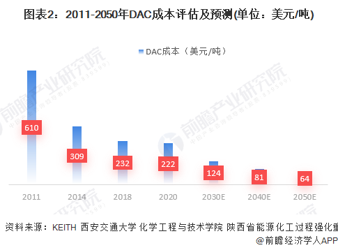 DAC技術(shù)2011年平均捕獲成本在610-780美元/噸二氧化碳,2020年平均捕獲成本為222-463美元/噸二氧化碳。隨著2020年代的商業(yè)化以及2040年代和2050年代的大規(guī)模實施,DAC系統(tǒng)的成本可能會大幅降低。