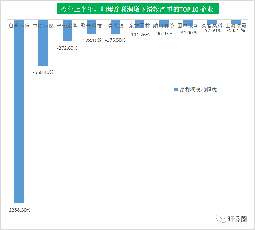 相反,同樣也有表現(xiàn)欠佳,未能在后疫情時代實(shí)現(xiàn)“業(yè)績翻盤”的營收增幅倒數(shù)TOP10企業(yè),這些企業(yè)有的是已經(jīng)引入國資,但混改成效不大,如雄安入主的科融環(huán)境,中節(jié)能旗下的中環(huán)裝備、節(jié)能鐵漢,濰坊國資接盤的巴安水務(wù);有的是營收和凈利潤財(cái)務(wù)指標(biāo)均下滑的的中創(chuàng)環(huán)保(曾用名三維絲)、惠城環(huán)保、綠茵生態(tài);還有的是營收下滑,凈利潤卻大增300.04%的菲達(dá)環(huán)保。(如圖七所示)圖七:半年度營收下滑較快的TOP10榜單▼