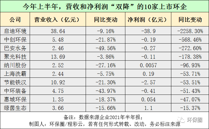 也就是說,今年上半年,111家上市環(huán)企中,無論是營業(yè)收入,還是歸母凈利潤方面,大家都表現(xiàn)得不錯,一掃2020年的悲觀情緒,70%以上的環(huán)保企業(yè)都向股東和市場交付了一張靚麗的答卷,實(shí)現(xiàn)了“后疫情時代”的強(qiáng)勢反彈。具體到個股,絕大多數(shù)企業(yè)也都在今年上半年開了個好頭,經(jīng)營業(yè)績打了個漂亮“翻身仗”。有的一改往日業(yè)績頹勢,歸母凈利潤實(shí)現(xiàn)百分之幾千增長,如雪浪環(huán)境,城發(fā)環(huán)境、雪迪龍;也有的逐步擺脫虧損帽子,歸母凈利潤實(shí)現(xiàn)百分之幾百的大增,如中金環(huán)境、嶺南股份、蒙草生態(tài)、津膜科技、菲達(dá)環(huán)保等;還有的細(xì)分領(lǐng)域龍頭,如上文提到格林美、碧水源、清新環(huán)境,也從去年疫情和產(chǎn)業(yè)寒冬的陣痛中慢慢地企穩(wěn)、好轉(zhuǎn),重現(xiàn)往日輝煌。歷經(jīng)了金融領(lǐng)域去杠桿、PPP政策強(qiáng)監(jiān)管、新冠肺炎疫情沖擊以及民企易主“混改潮”后,這些上市環(huán)企雖然有過迷茫,有過失敗,有過反思,但最終還是重拾信心,不屈不撓,終于迎來了業(yè)績復(fù)蘇。不過,今年上半年,在業(yè)績普遍好轉(zhuǎn)的背景下,依然還是有個別環(huán)保企業(yè)“不爭氣”,表現(xiàn)差強(qiáng)人意,比如啟迪環(huán)境、巴安水務(wù)、節(jié)能國禎、聚光科技、中環(huán)裝備等10家企業(yè)(如圖三所示),營收和凈利潤雙雙下滑,甚至有的企業(yè)較上年同期,虧損幅度擴(kuò)大化,前景堪憂。圖三:今年上半年,營收和凈利潤“雙降”的10家上市環(huán)企▼