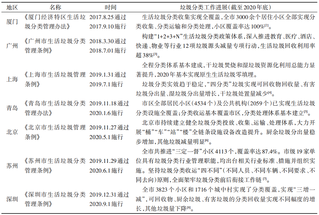 表 1    中國部分省市地區(qū)生活垃圾分類相關(guān)政策及工作進(jìn)展