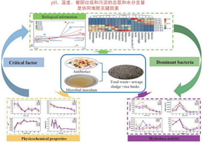 Chen等[39]將餐廚垃圾與污水污泥進(jìn)行協(xié)同好氧堆肥,研究了抗生素對水解酶活性和微生物群落的影響,發(fā)現(xiàn)5 mg/kg 的抗生素會降低纖維素酶的活性,增加脂肪酶和蛋白酶的活性,pH和溫度是影響微生物群落演替的最重要因素,其次是餐廚垃圾和污泥的共同堆肥過程中的總氮和水分含量(圖 4[39])。