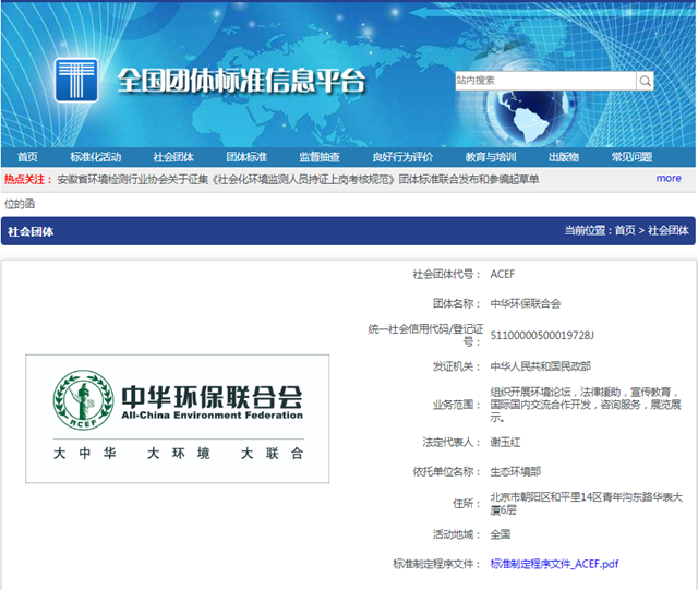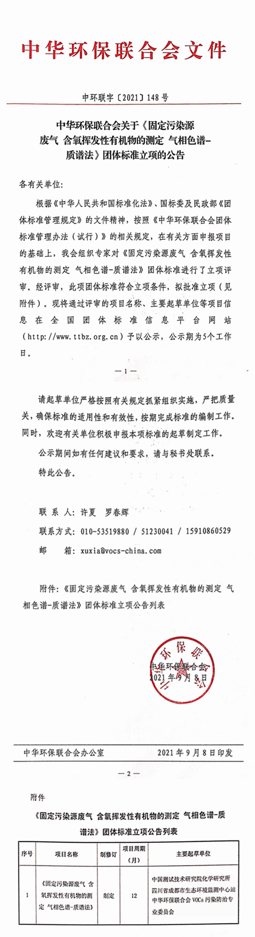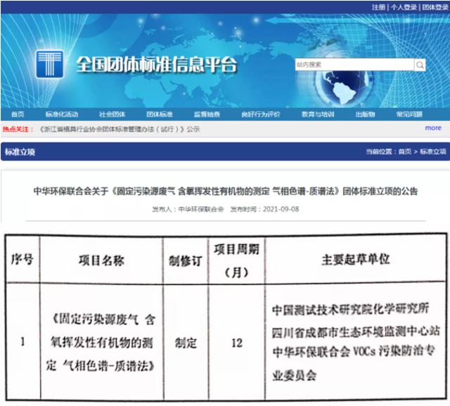 為了貫徹落實《中華人民共和國標準化法》、國務(wù)院《深化標準化工作改革方案》、國家標準化管理委員會和民政部印發(fā)的《團體標準管理規(guī)定》(國標委聯(lián)〔2019〕1號)的文件精神;按照《中華環(huán)保聯(lián)合會團體標準管理辦法(試行)》要求,經(jīng)中華環(huán)保聯(lián)合會立項批準,由中國測試技術(shù)研究院化學研究所、四川省成都市生態(tài)環(huán)境監(jiān)測中心站和中華環(huán)保聯(lián)合會VOCs污染防治專業(yè)委員會等單位共同發(fā)起的全國團體標準《固定污染源廢氣 含氧揮發(fā)性有機物的測定 氣相色譜-質(zhì)譜法》起草制定工作現(xiàn)已啟動;按照流程,標準項目信息已獲得全國團體標準信息平臺的立項公示。